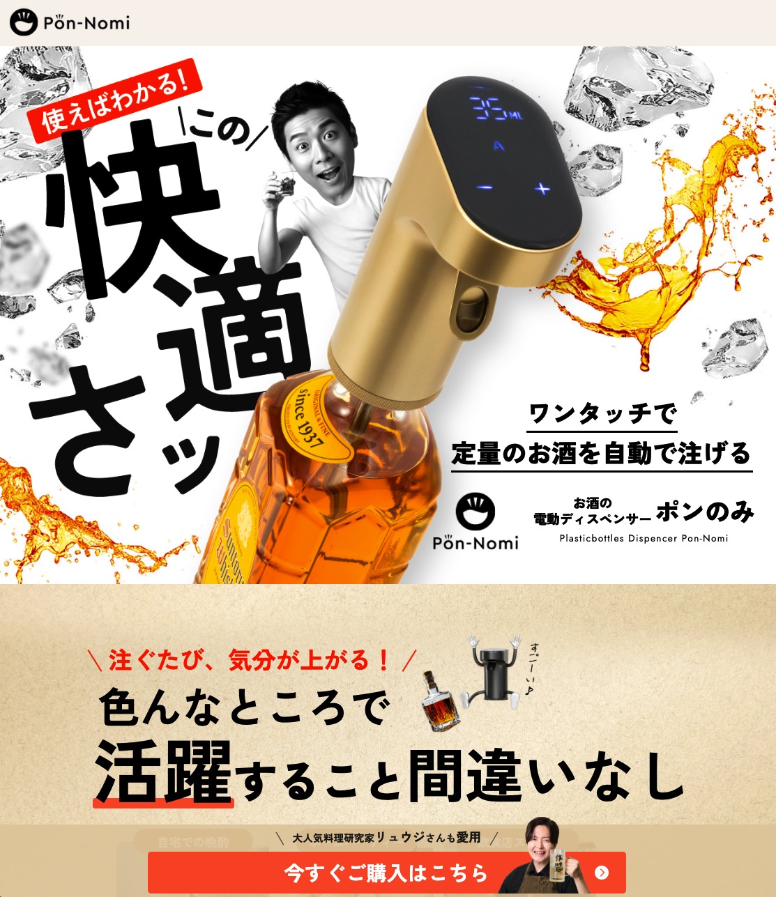 公式サイトはこちら お酒の電動ディスペンサー「ポンのみ」について 料理研究家リュウジさんも愛用し、動画で「これ最高」と絶賛したことで話題の電動ディスペンサー「ポンのみ」。 瓶の口に取り付けるだけで、ワンプッシュでお酒を注げる優れものです。重い一升瓶や4Lペットボトルを持ち上げる必要がなく、注ぎこぼしのストレスもゼロ。定量設定が可能で、誰でも黄金比のハイボールや水割りが作れます。晩酌をより手軽に、スマートに楽しみたい方に欠かせない、宅飲みの新定番アイテムです。 商品名 ポンのみ カテゴリ 生活