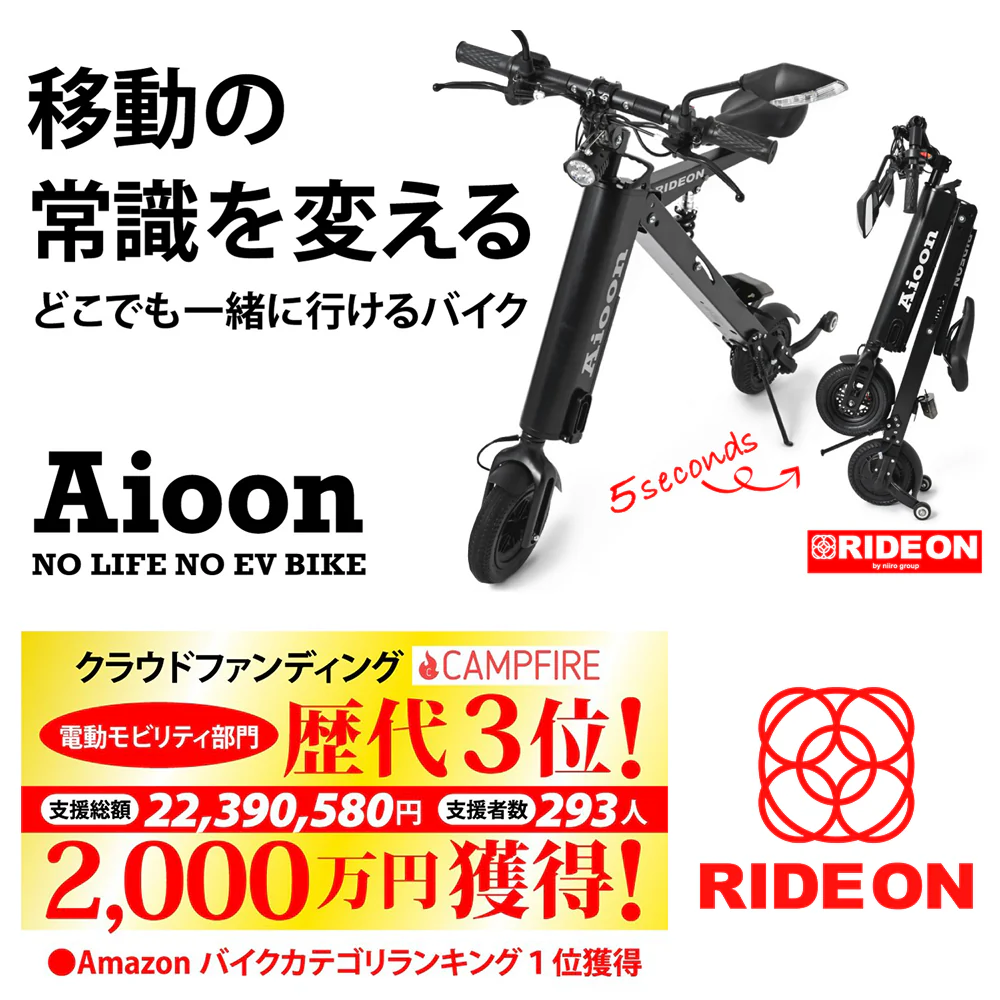 「Aioon(アイオーン)」は、都会の移動をスマートに変える公道走行可能な折り畳み式電動バイクです。