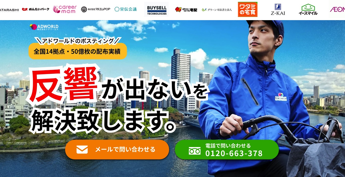 アドワールドは、業界屈指の配布精度と実績を誇るポスティングのスペシャリスト集団です。単に配るだけではなく、GPS完備による徹底した管理体制と、独自の配布ノウハウによって「届くべきターゲット」へ確実に情報を届けます。全国主要都市をカバーするネットワークと、地域特性を熟知したスタッフの対応により、反響率の最大化を支援します。低価格競争に陥ることなく、成果にこだわる企業のパートナーとして選ばれ続けているのがアドワールドの強みです。商圏分析に基づく戦略的な配布設計から、迅速な実行までをワンストップで提供し、御社の集客課題を最短距離で解決へと導きます。